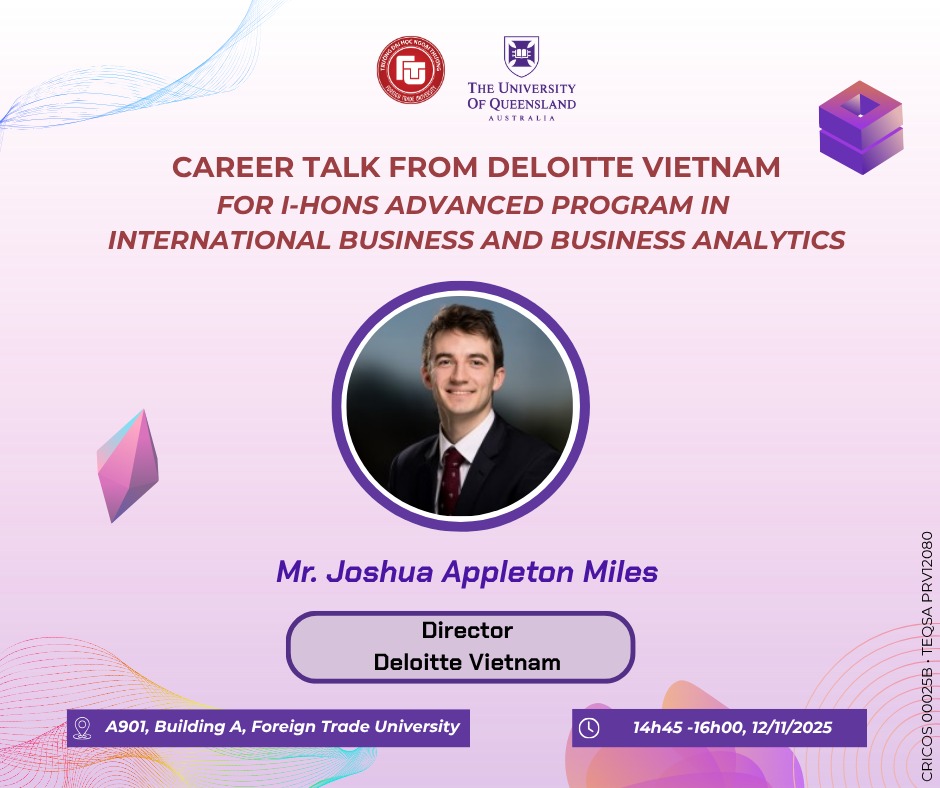 Chương trình vinh dự đón tiếp Mr. Joshua Appleton Miles – Giám đốc Deloitte Vietnam, đồng thời là cựu sinh viên Đại học Queensland (UQ Alumni). Với nhiều năm kinh nghiệm trong lĩnh vực tư vấn và quá trình phát triển sự nghiệp tại môi trường quốc tế, diễn giả sẽ mang đến những chia sẻ chuyên sâu về xây dựng năng lực nghề nghiệp, thích ứng trong môi trường toàn cầu và những kỹ năng được các nhà tuyển dụng hàng đầu tìm kiếm.
