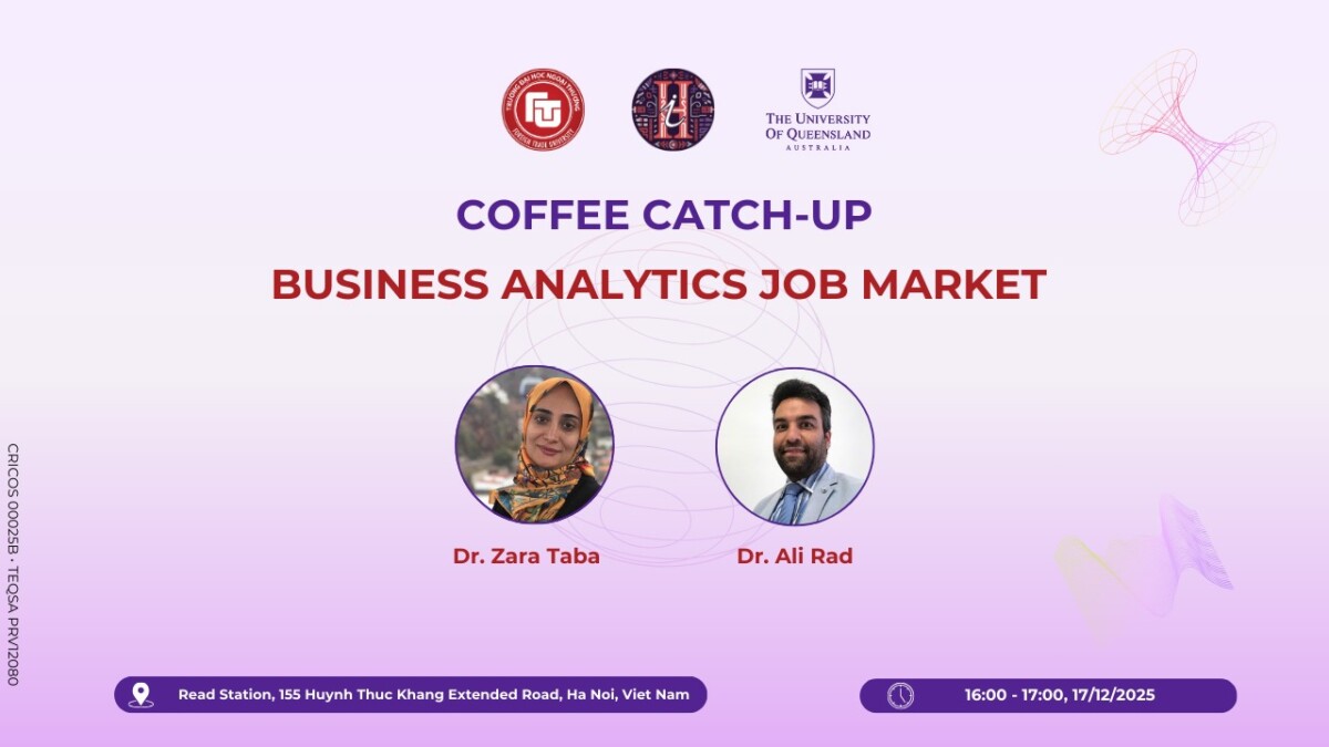 Chương trình vinh dự có sự tham gia của TS. Zara Taba – Giảng viên Đại học Queensland và TS. Ali Rad, những chuyên gia giàu kinh nghiệm trong lĩnh vực Phân tích dữ liệu và Kinh doanh. Thông qua hình thức trao đổi cởi mở, gần gũi, các diễn giả sẽ chia sẻ những góc nhìn chuyên sâu về xu hướng phát triển của ngành Business Analytics, nhu cầu nhân lực của thị trường, cũng như những kỹ năng và năng lực cốt lõi mà sinh viên cần chuẩn bị để đáp ứng yêu cầu nghề nghiệp trong bối cảnh chuyển đổi số.