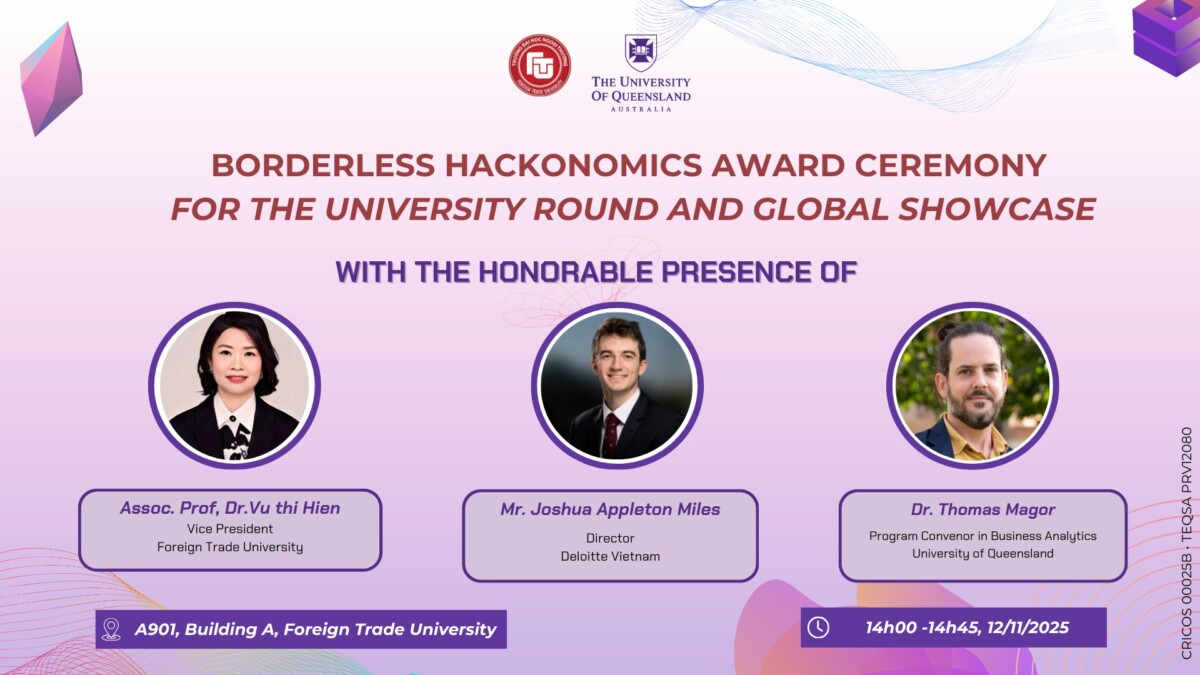 Lễ trao giải cuộc thi Borderless Hackonomics 2025 sẽ được tổ chức từ 14 giờ đến 14 giờ 45 ngày 12/11/2025 tại phòng A901, Nhà A, Trường Đại học Ngoại thương (91 Chùa Láng, Hà Nội).