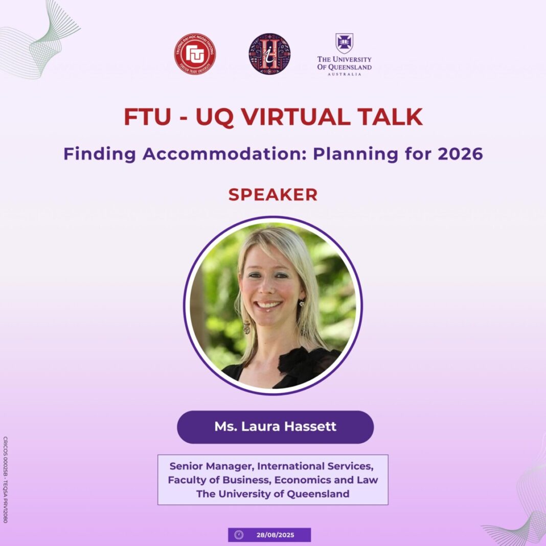 Nhằm hỗ trợ sinh viên Chương trình Tiên tiến i-Hons trong quá trình chuẩn bị chỗ ở khi sang Đại học Queensland học tập, sự kiện Virtual Talks: Finding Accommodation – Planning for 2026 sẽ mang đến những thông tin thiết thực và hữu ích về việc tìm kiếm, lựa chọn cũng như lên kế hoạch nhà ở tại Úc.