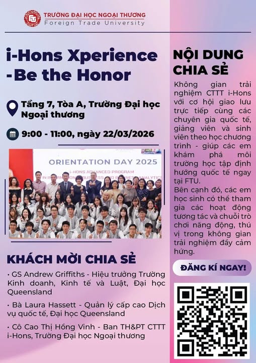 Để giúp các bạn học sinh và phụ huynh hiểu rõ hơn về Chương trình Tiên tiến i-Hons ngành Kinh doanh quốc tế & Phân tích dữ liệu kinh doanh, sự kiện “i-Hons Xperience – Be the Honor” sẽ mang tới cơ hội gặp gỡ trực tiếp đại diện Đại học Queensland, các thầy cô và Mạng lưới sinh viên i-Hons để cùng khám phá môi trường học tập quốc tế ngay tại FTU.